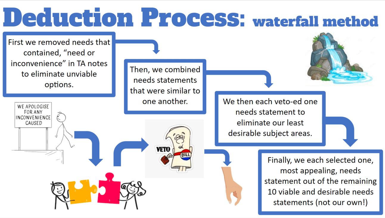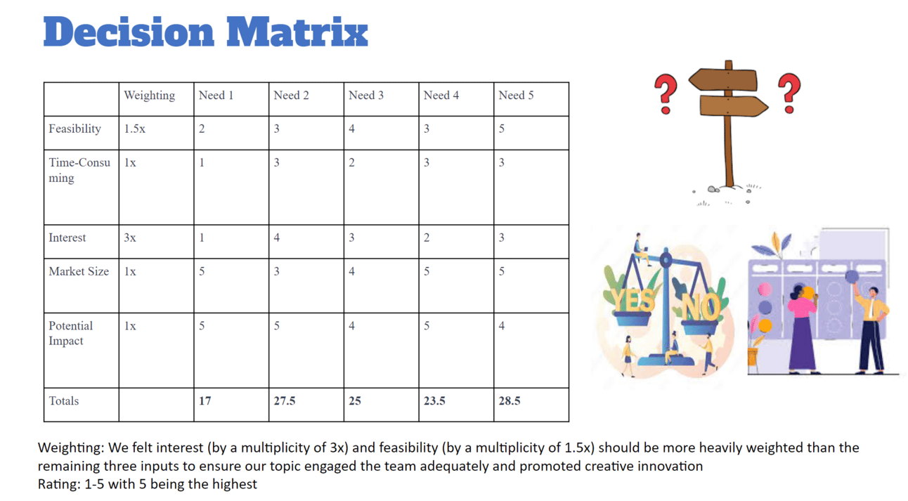 We first had to decide what topic to tackle and wrote down 5 need statements each without including a solution in the need statement.